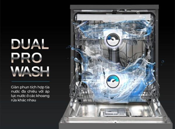 Công nghệ DualProWash giúp rửa sạch mạnh mẽ và nhẹ nhàng cùng lúc, tiết kiệm thời gian, bảo vệ đồ dùng, tối ưu hiệu suất, phù hợp nhiều loại bát đĩa khác nhau.